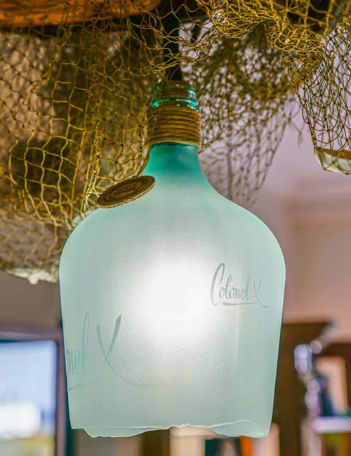 Unsere Dekorationen sind allesamt Unikate und pure Handwerkskunst. Eine meterlange Wurzel in Strandgutoptik direkt hinter dem Eingang wurde von uns oberflächenveredelt und mit abgenutzten Haken, Seilen und Fischernetzen aufgewertet. Ihre Lampen aus alten, unterschiedlich geformten und aufgeschnittenen Flaschen sind echte Hingucker – jede für sich. Die Marke des Ladens, Colonel X, ziert einzelne Glasoberflächen – ein