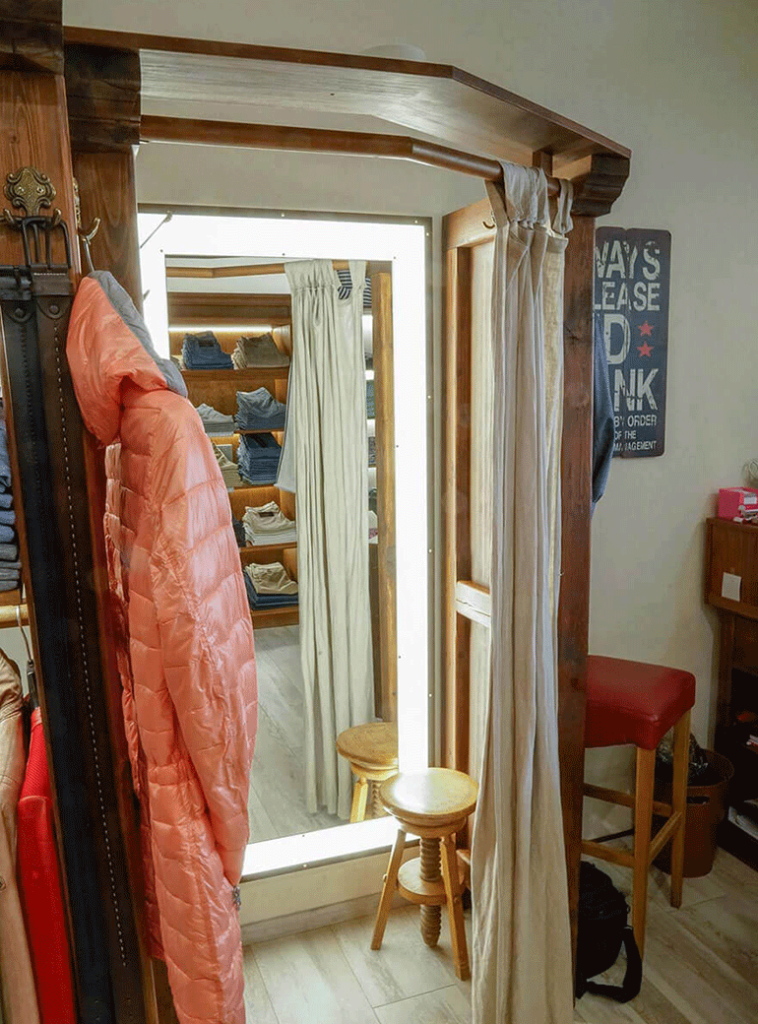 Ein echtes Highlight ist der beleuchtete Design-Spiegel in der Umkleidekabine – ebenfalls eine Eigenentwicklung. Die einst gewöhnliche Spiegelfläche erhielt einen LED-Rahmen aus Aluminium und Licht streuendem Acryl. Der Betrachter in der Ankleide wird perfekt in Szene gesetzt – ohne störende Blendeffekte oder Reflexionen.