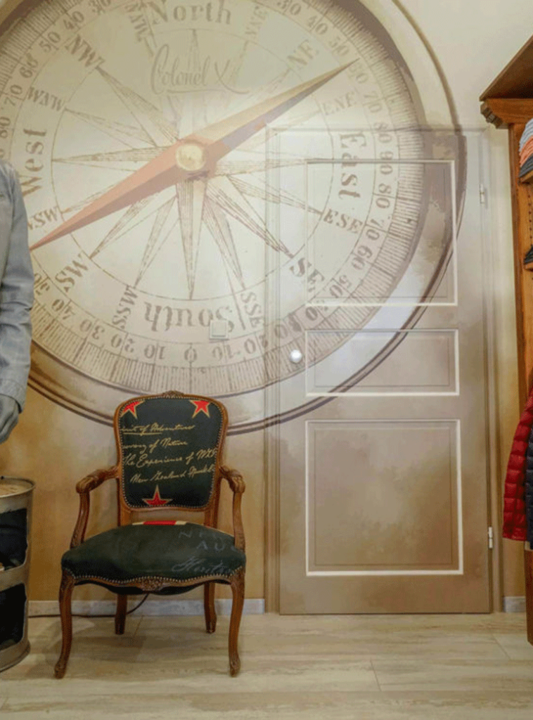 Ausstrukturierte und mit Palisander lasierte Balken an der Decke unterstreichen die Persönlichkeit des Ladens. Sie wurden in die Stuckleisten integriert und bilden mit ihnen eine optische Einheit. Sie schließen mit der Wandgestaltung des Ladens ab: Ein Druck, der nicht nur über die Wand, sondern auch über die Tür verläuft, zeigt eine Windrose im alten Seefahrer-Stil. Über der Kompassnadel findet sich das Logo der Marke ein weiteres Mal wieder. Der Betrachter erkennt es erst auf den zweiten Blick. Die beiden, einst störenden Lichtschalter an der Wand, werden nicht mehr wahrgenommen. Auch die Tür mit ihrem gewaltigen Rahmen geht in der Gestaltung gekonnt unter.
