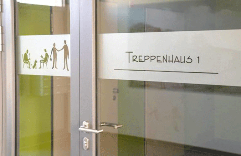 Die 3,50 Meter hohe Reliefgrafik an der Fassade produzierten wir aus PUR-Schaumstoff mit individuell angepasster Härtung. Eine professionelle Lackierung der Oberflächen sorgt auch langfristig für kraftvoll strahlende Farben. Darüber hinaus fertigten wir für die Außenanlage ein exklusives Banner mit einer Fläche zur Kreidebeschriftung. Innen statteten wir die Gänge mit Acryl-Schildern (mit Stand-off-Block) sowie Glasdekorfolien als Durchlaufschutz für Türen aus. Das Design der Folien passt selbstverständlich zu den Grafiken der Corporate Design-Vorgaben.