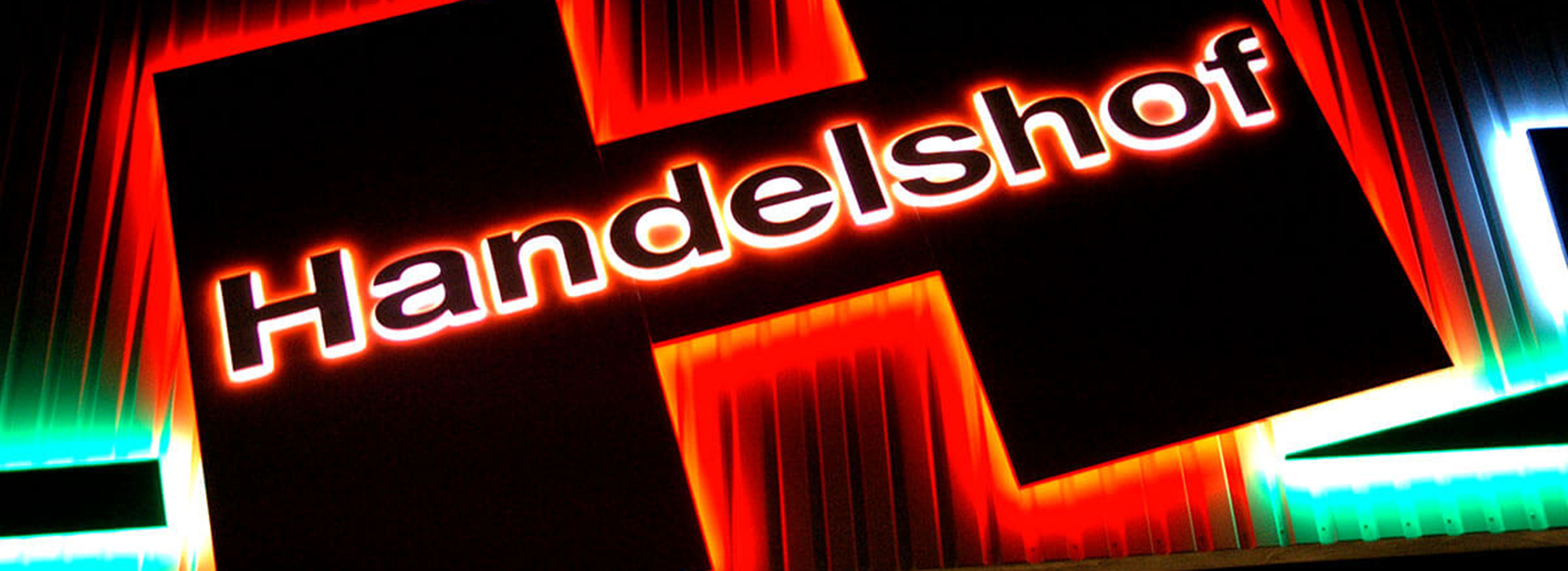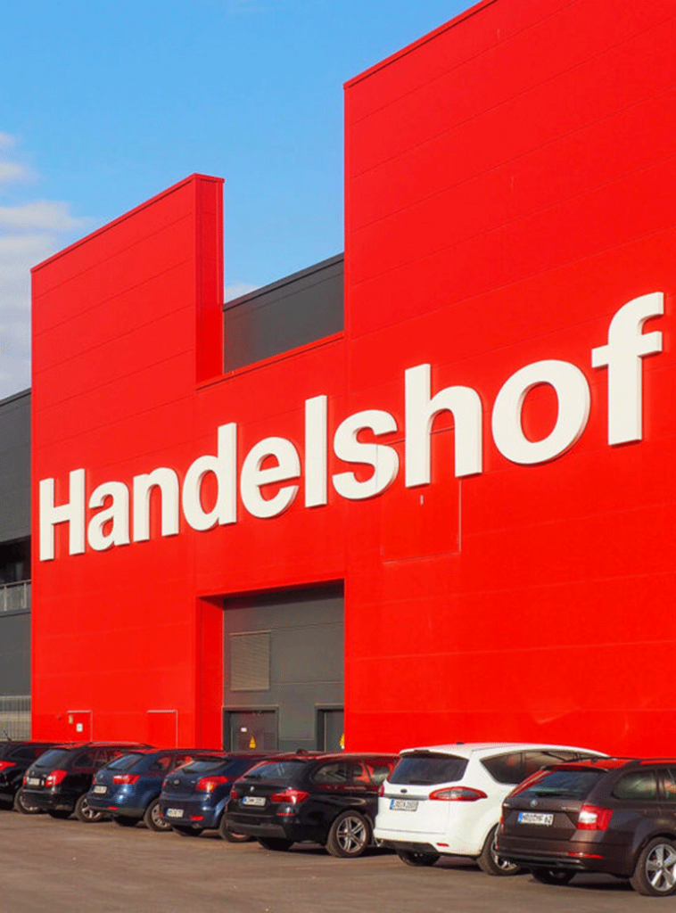 Weithin sichtbar sein: Dafür sorgen zwei beleuchtete Profilschriftzüge mit einer Länge von 13 bzw. 26 Metern an der West- und der Südfassade. Sie strahlen im typischen Handelshof-Rot. Um eine optimale Lichtfarbe zu garantieren, wurden nicht nur rote transluzente Acryl-Spiegel, sondern auch rote Marken-LEDs verbaut. Kabel und Treiber/Trafos verlegten wir – vor Wind und Wetter geschützt – im Inneren des Objektes. Ein weißer unbeleuchteter Aluminium-Schriftzug mit einer Länge von 21 Metern weist Autobahngäste im Osten auf den Handelshof hin. Bemerkenswert sind die Buchstaben „S“ und „H“: Sie wurden von uns „modular“ gefertigt, um den Zugang zu einer Versorgungstür hinter der Werbeanlage zu gewährleisten. Wird die Fassadentür geöffnet, klappen Teile der Buchstaben mit der Tür nach außen.