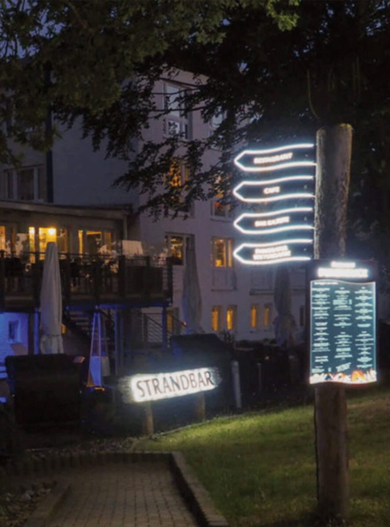 Für die Beleuchtung der Außenterrasse fertigten wir klassische, nach vorne leuchtende Profil 5-Buchstaben mit energiesparenden LED-Modulen. Ein besonderes Merkmal unserer Ausführung sind die abgeflachten Kanten. Sie sorgen für den kleinen, aber feinen optischen Effekt einer „weichen Kante“.