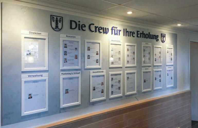 Einzelschilder produzierten wir aus gelasertem Acryl mit hinterklebtem Foliendruck und Standoffblock. Die Einzelrahmen für die große Infowand bestehen dagegen aus gefrästem Acryl mit eingelegten Magneten – perfekt für den schnellen Austausch. Auch diese Schilder stellten wir in unserem Maschinenpark her – von der ersten Schraube bis zum fertigen Produkt. Wir verklebten Glasdekorfolie als Sicht- und Durchlaufschutz auf unterschiedlichen Scheiben im Gebäudetrakt. Zudem beschrifteten wir unterschiedliche Fahrzeuge.