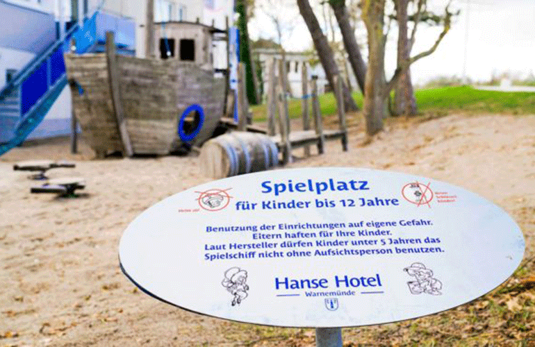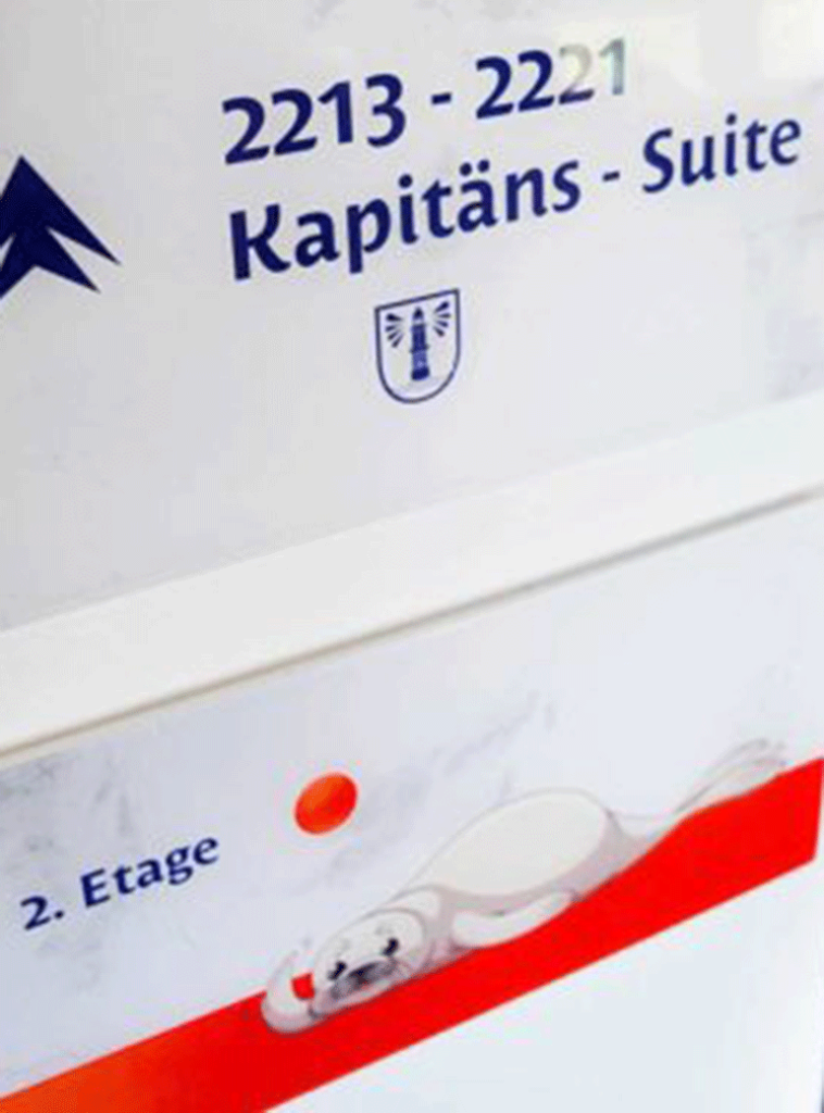 Auf Basis dieser Gestaltung entwickelten wir Schilder für die Innenbereiche des Hotels die Außenanlage. Die vielen Aufgänge und Flure stellten uns vor eine kleine Herausforderung. Wir lösten die Aufgabe mittels einer intelligenten Besucherführung. Sie setzt auf markante Farben für die Etagen und eine ballspielende Robbe, dem Maskottchen des familienfreundlichen Hotels. Auf diese Weise können sich auch die kleinen Gäste bestens orientieren.