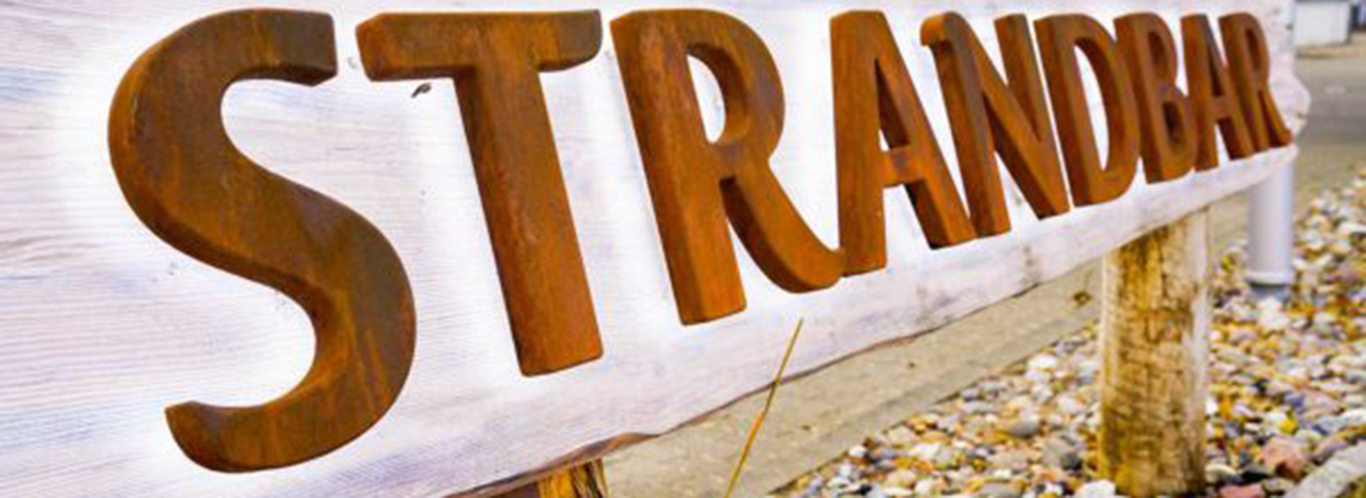 Am liebsten kombinieren wir natürliche Materialien mit modernen Werkstoffen. Für Hotelwegweiser und Speisekarten im Außenbereich verwendeten wir jahrzehntealte Buhnen, die stark von Meer, Pfahlbormuscheln und Holzbohrwürmern gezeichnet sind. Darüber hinaus arbeiten wir sehr gut und gerne mit COR-TEN-Stahl. Dieses Material bildet im Freien eine natürliche Rostschicht. Den Effekt machen wir uns zunutze, um bei unserer Außenwerbung dekorative Akzente zu setzen. Selbst bei Nacht kommt die charakteristische Patina sehr gut zur Geltung.