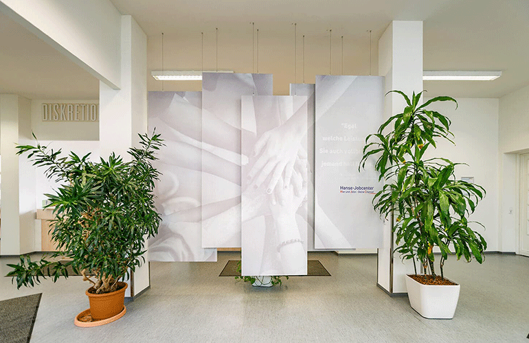 Im Rahmen des Projektes „Arbeit sichtbar machen 2.0“ benötigte das Hanse-Jobcenter Rostock ein Kundenleitsystem für seine zwei Standorte am Friedrich-Engels-Platz und in der Schweriner Straße. Dieses Wegeleitsystem sollte nicht nur leiten, sondern begrüßen und für die Suchenden eine angenehme Atmosphäre schaffen.