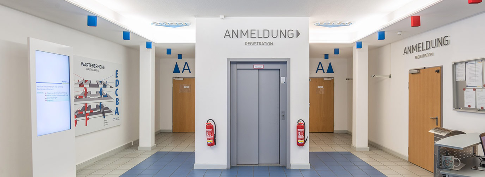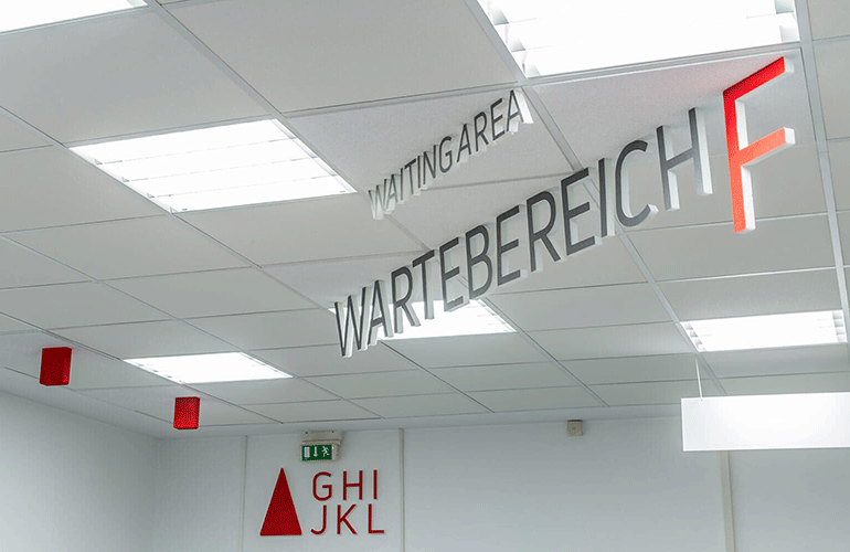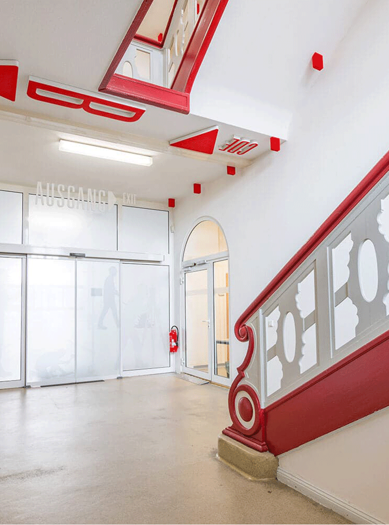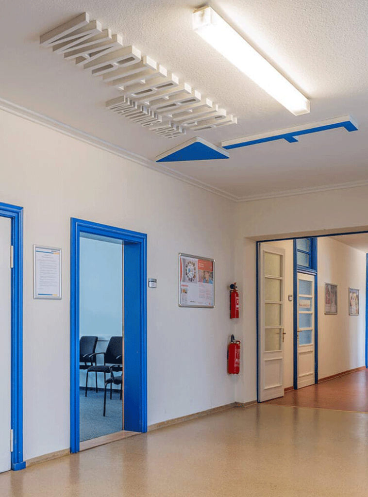 An den beiden Standorten führen mehrere Treppenhäuser in verschiedene Gebäudekomplexe. Um eine schnelle Orientierung zu ermöglichen, verzichteten wir darauf, allen zentralen Bereichen Farben zuzuweisen. Das ist zwar durchaus typisch, irritiert jedoch die meisten Menschen sehr schnell. Lediglich zwei Farben führen nun durch die Gebäude: rot und blau. Anhand von Linien in Form aufeinander abgestimmter Designelemente erkennen die Besucher auf den ersten Blick, welchen Weg sie einschlagen müssen. Zusätzlich weisen ansprechende 3-D-Einzelbuchstaben, 3-D-Schriftzüge und -Pfeile direkt zum Ziel.