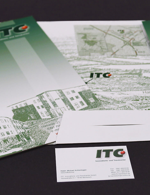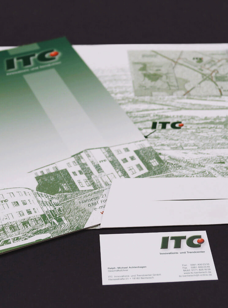 In all den Jahren ist einiges zusammengekommen: Wir haben die Fassade des ITC-Gebäudes gestaltet, die Geschäftsausstattung gedruckt und Firmenwegweiser gefertigt. ITC-Hausmeister tragen Kleidung, die wir bedruckt haben, und wir produzieren regelmäßig Flyer und Roll-up-Banner zu unterschiedlichen Anlässen.