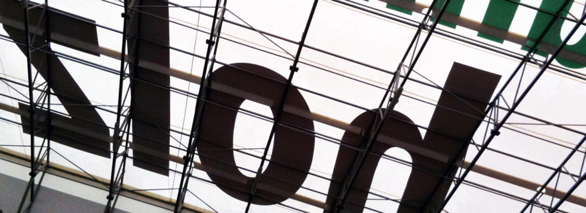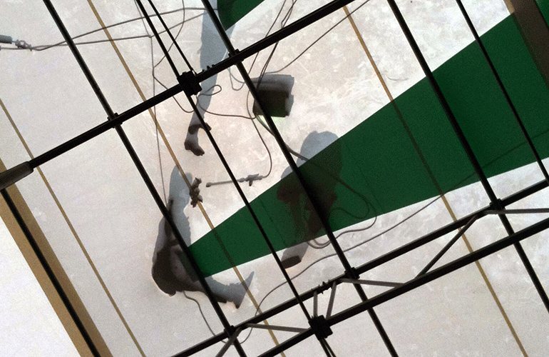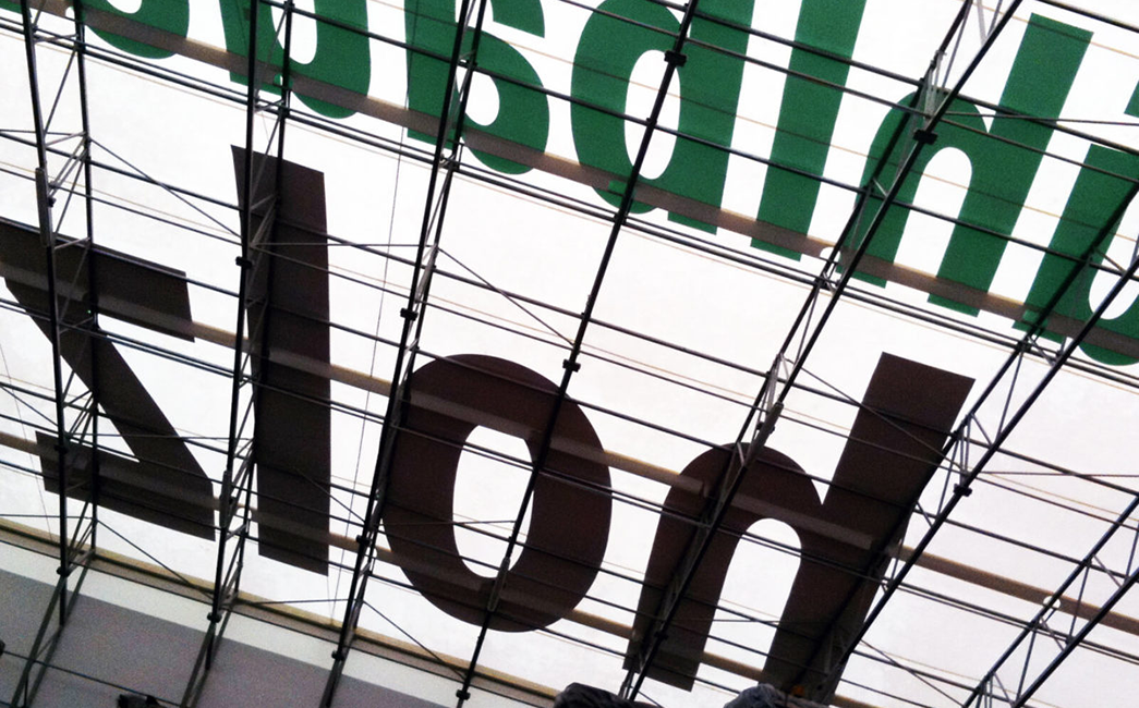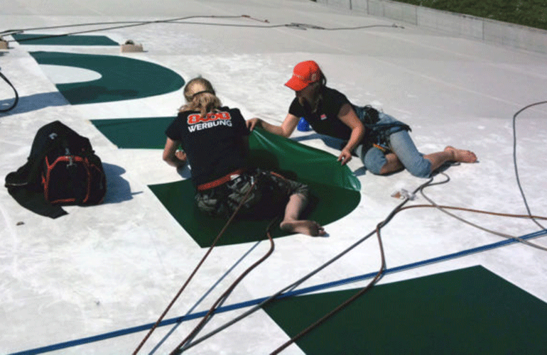 Auf das transluzente PVC-Planendach haben wir innerhalb von 14 Tagen die transluzente Folie aufgebracht. Text und Grafik maßen zusammen 30 mal 19 Meter. Die Sonne brannte vom Himmel und wir haben uns den Feierabend redlich verdient. Jeden Abend stiegen wir mit schwarzen Füßen und auch sonst ziemlich verrußt vom Dach. Denn über der Halle verlief die Einflugschneise des Wiener Flughafens und verbrannte Treibstoffabfälle rieselten herab. Obwohl wir jeden Abend völlig k.o. waren, erinnern wir uns immer wieder gerne an unser Wien-Abenteuer.
