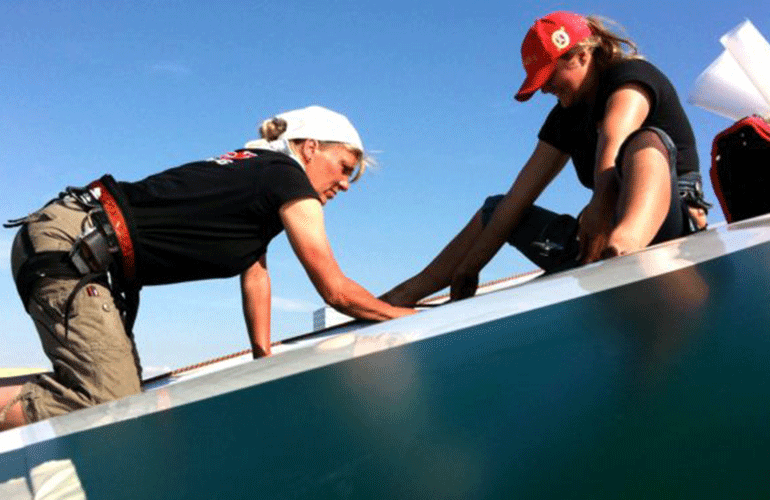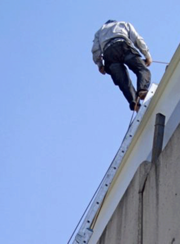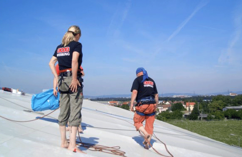 So richtig verausgabt haben sich vier BOOB-Mitarbeiter bei der Dachbeschriftung des Unternehmens Mühlbauer Holz. Es ging um die Beschriftung einer Leichtbauhalle in der Nähe von Wien. Das Dach war allerdings eine flexible PVC-Plane – und das Arbeiten darauf eine extrem wackelige Angelegenheit. Wenn sich einer bewegt, wackeln alle – und das mit mikrodünner Folie in den Händen. Hinzu kam die Dachkante in rund 8 Metern Höhe. Ohne gute Kletterausrüstung war da nichts zu machen.