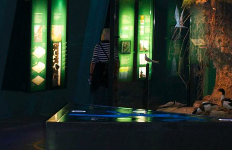 Zusätzlich wurde das Ozeaneum mit Beschriftungen und Schildern ausgestattet – für die Ausstellungen, für die Kassen, Toiletten und Aufzüge. Alles in Museumsqualität, versteht sich. Das erfordert genau abgestimmte Arbeitsschritte: Fräsen, Grundieren, Schleifen und Lackieren (nach RAL oder Pantone), UV-Druck und Versiegelung mit Schutzlack. Der war supermatt, um Reflexionen zu vermeiden. Übrigens: Die Arbeiten vor Ort haben wir nachts erledigt, um den laufenden Betrieb nicht zu stören.