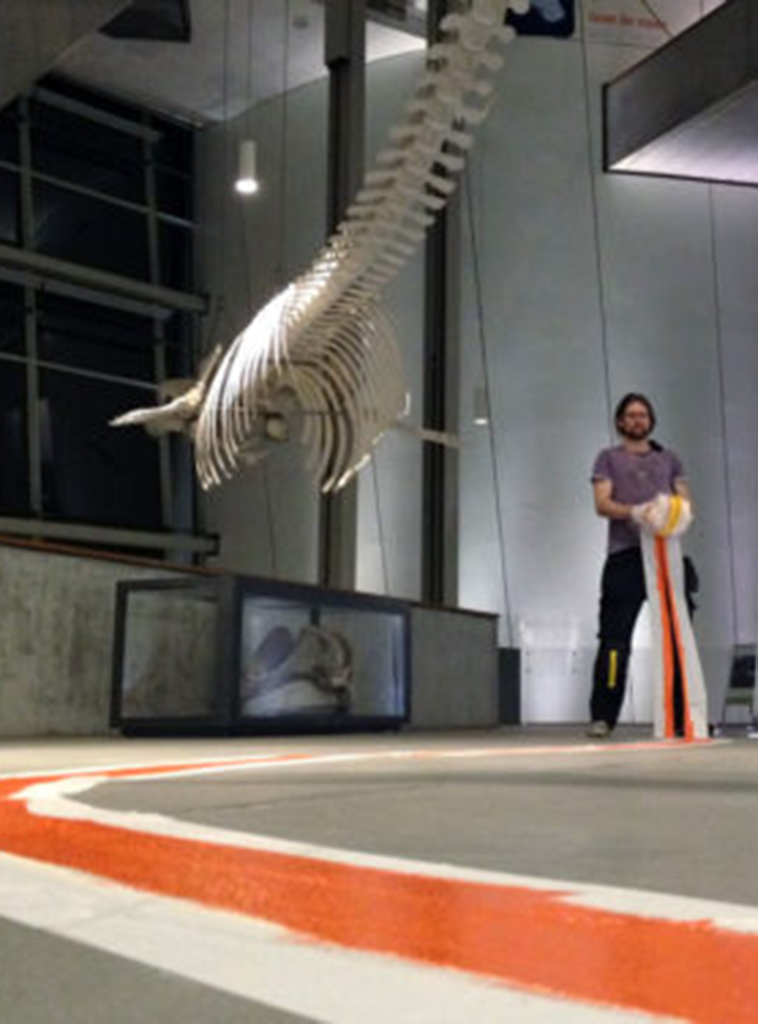 Im Stralsunder Ozeaneum haben wir auf 800 Quadratmetern ein Wegeleitsystem verwirklicht. Eine Linie auf dem Boden führt die Besucher von Ausstellung zu Ausstellung. Natürlich nicht irgendeine Linie, sondern eine absolut robuste. Eine, die jährlich rund 850.000 Besucher und ihre 1,7 Millionen Füße aushält. Um diese Anforderung zu erfüllen, haben wir die Linie mit einem speziellen, strapazierfähigen Lack auf dem Boden aufgetragen.